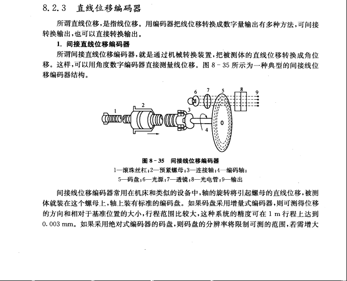 | 以下是引用片段: 8.2.3 直線位移編碼器 1.間接直線位移編碼器 所謂間接直線位移編碼器,就是通過機(jī)械轉(zhuǎn)換裝置,把被測(cè)體的直線位移轉(zhuǎn)換成 |